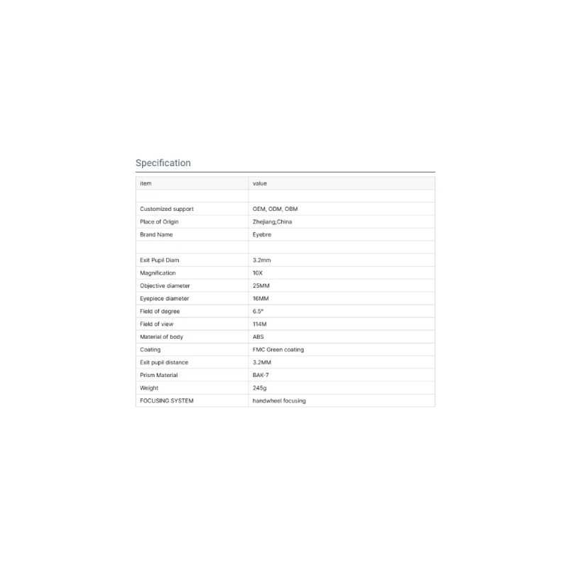 قطر دهانه: 2.5 میلی متر / بزرگنمایی: 10 برابر / میدان دید: 104 / نوع منشور: Porro
